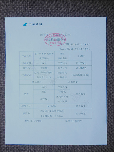 蔡氏舒咽康保健貼檢驗報告